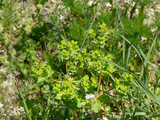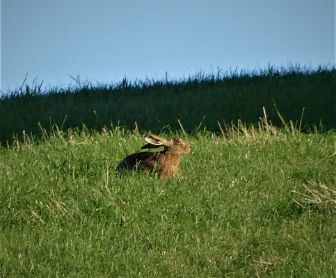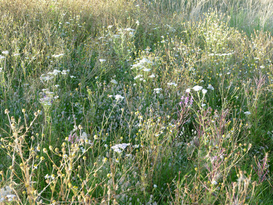 Sommerlich trocken präsentiert sich die Blühfläche im Juli. Einige Schafgarben und Wilde Möhren überragen die Fläche, die sonst recht unspektakulär aussieht. Der Hasenklee und verblühte Ackerstiefmütterchen sind die dominierenden "kleinen"Pflanzen. Die alte Blühfläche ist auch weitgehend abgeblüht, dafür kommen jetzt die Samen der Blühpflanzen zum reifen. Hoffentlich verteilen Vögel und Insekten diese auch über die bereits bestehenden Flächen hinaus. Ansonsten ganz viele Streifenwanzen und auf den umliegenden Wiesen und abgeernteten Äckern der eine oder andere Feldhase.