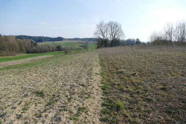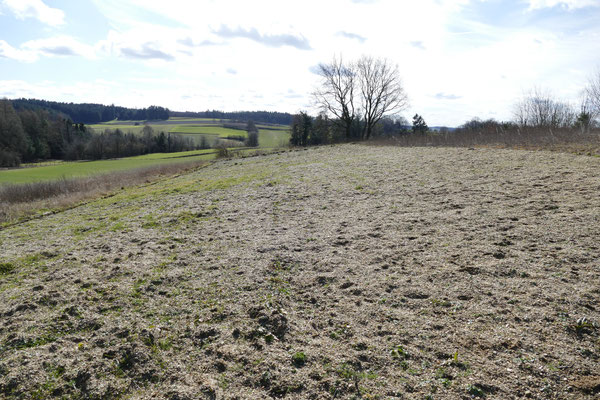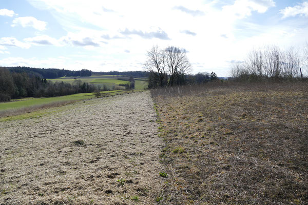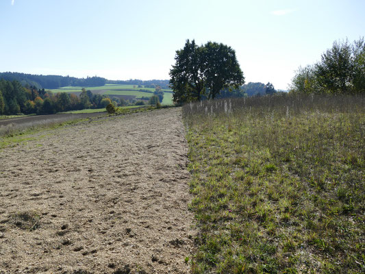 Mitte September haben wir, auf der von uns betreuten Schutzfläche für die Rebhühner, eine weitere Blühfläche angelegt. Der Boden wurde mit dem Pflug vorbereitet, so dass wir ein freies Saatbett vorfanden. Auf dem sehr trockenen und sandigen Untergrund haben wir sogenannten Heudrusch als Saatgut ausgebracht. Dieser entsteht, wenn nach dem Mähen von Blühflächen das Mähgut getrocknet und ausgedroschen wird. Die von uns verwendeten Samen stammen vom Windsberger Hang. Um eine gleichmäßige Aussaat zu gewährleisten, haben wir das Saatgut mit Weizenkleie in einem Verhältnis ca 1:2 gemischt. Nun sind wir gespannt, wie sich die Fläche in den nächsten Monaten entwickelt, geplant ist, dass wir diese Entwicklung in monatlichem Abstand fotografisch dokumentieren.