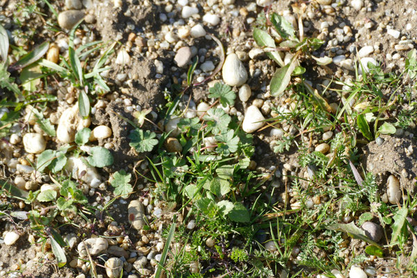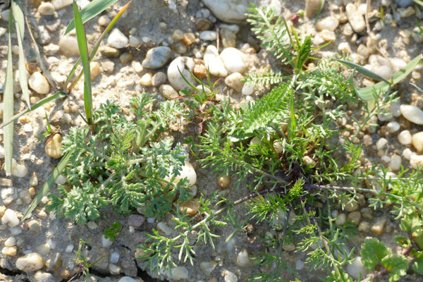 Auf den ersten Blick scheint sich auf der Fläche nicht viel getan zu haben. Der grüne Schimmer kommt von Gräsern, die sich vom Unterpflügen nicht haben beeindrucken lassen. Auf den zweiten Blick finden sich aber doch eine Vielzahl von kleinen Pflänzchen, typische Ackerbewohner wie die rote Taubnessel oder das Ackerstiefmütterchen. Aber auch Karthäusernelken und verschiedene Kamillepflanzen lassen sich bereits erkennen. Wir freuen uns auf die weitere Entwicklung.