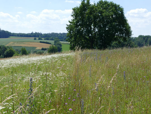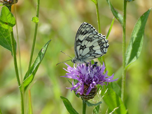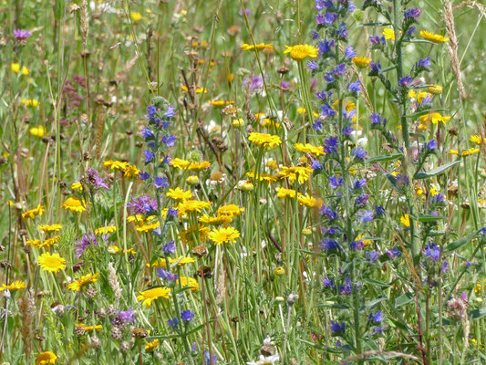 Der viele Regen im Juni hat der Blühfläche gut getan. Doch im Gegensatz zu unserer "alten"Blühfläche lässt die Artenvielfalt noch sehr zu wünschen übrig. Es dominiert die weiß blühende geruchlos Kamille, auf der Altfläche zeigt sich dagegen ein ganz anderes Bild. Natternkopf und Flockenblumen blühen hier, zusammen mit Färberkamille und Karthäusernelke. Auf beiden Flächen kann man viele Schachbrettfalter und andere kleine Schmetterlinge beobachten.
