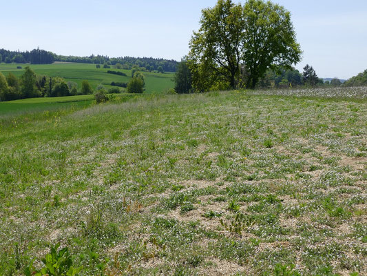Noch immer wächst auf der Neuansaat verhältnismäßig wenig und vor allem auch viele normale Ackerkräuter. Zurzeit dominieren die Acker-Stiefmütterchen. Dafür blühen auf der älteren Blühfläche Margeriten, Nelken und Wiesensalbei.
