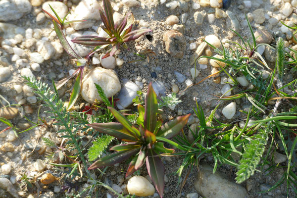 Sieht jetzt nicht nach einer spektakulären Veränderung aus, wenn man aber genauer hinschaut, kann man erkennen, dass sich insbesondere bei den speziellen Trockenrasenpflanzen einiges entwickelt hat. Auch scheinen schon die ersten Wildbienen den trocken warmen Standort für sich entdeckt zu haben, auf dem dritten Bild kann man oben in der Mitte einen Brutgang entdecken.